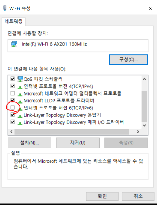 3. 동그라미 친 '인터넷 프로토콜 버전 6(TCP/IPv6) 체크 없앰.